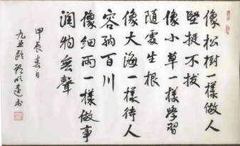 顧先生有許多人生感悟的箴言,也喜歡用毛筆寫出來,自我欣賞,或與人共勉。如他寫的這樣四句話:“像松樹一樣做人,堅挺不拔;像小草一樣學習,隨處生根;像大海一樣待人,容納百川;像細雨一樣做事,潤物無聲。”許多人在欣賞這幅書作的同時,也把它作為自己的座右銘。