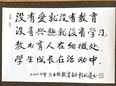 顧先生多次用毛筆寫過他的四句簡潔而樸素的教育信條:“沒有愛就沒有教育,沒有興趣就沒有學習,教書育人在細微處,學生成長在活動中。”許多學校把它復制張掛,成為學校教育的行動指南。
