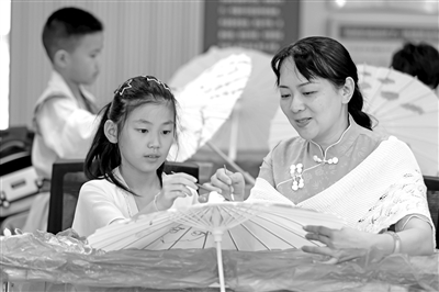 7月9日,在福建省福州市鼓樓區水部街道,志愿者正在指導孩子們繪制油紙傘。當天,在福州市鼓樓區水部街道,一場“妙筆油紙傘 傳承非遺夢”暑托班主題課程正在進行,20名進城務工人員子女在志愿者的指導下,體驗省級非遺福州油紙傘制作技藝的獨特魅力。暑假期間,福建省各級工會、關工委精心組織開設安全課堂、鄉土文化探索、非遺課堂拓展等暑托班課程,確保孩子們在暑托班中學有所獲、學有所悟。