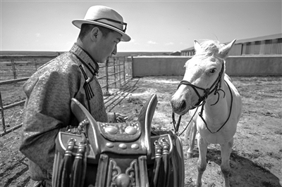 烏云達來準備給馬裝馬鞍(7月17日攝)。2017年,烏云達來從內蒙古農業大學畢業,回到西烏珠穆沁旗烏蘭哈拉嘎蘇木額日和圖敖包嘎查,成為一名“牧馬人”。在他的精心照料下,他家白馬群已擴大到90多匹。在位于內蒙古錫林郭勒盟的西烏珠穆沁草原上,越來越多的大學生返鄉成為新牧人,為當地鄉村振興注入活力。新華社記者 連振 攝