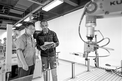 涂則鋼(右)在天津職業技術師范大學教師鐘平的指導下測試工業機器人編程系統(7月19日攝)。新華社記者 孫凡越 攝