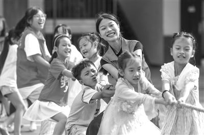 近日,湖南省永州市道縣仙子腳鎮黃田崗村,志愿者和孩子們一起進行拔河比賽。連日來,道縣團縣委組織大學生志愿服務隊走進鄉村開展“七彩暑假·情暖童心”志愿服務活動,通過開設唱歌、安全、學業輔導、體育活動等多元課程方式,關愛鄉村孩子,陪伴他們快樂過暑假。