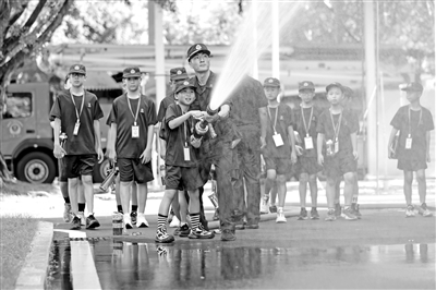 7月29日,在福建省廈門市海滄區消防救援大隊,小學生在消防員的指導下體驗手持水槍“滅火”。新華社發