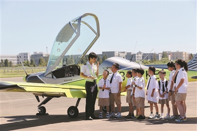 7月30日,在浙江省湖州市德清縣通航智造小鎮莫干山機場,工作人員向逸夫小學學生普及航天科學知識。當日,該校開展“科技筑夢,創想未來”暑期主題實踐活動,組織學生走進通航智造小鎮通用航空科普館參觀體驗,讓孩子們樂享科技暑假。謝尚國 攝