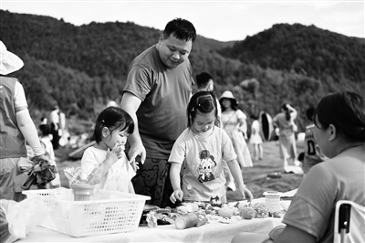8月25日,家長帶著小朋友觀看大元社孩子們制作的手工藝品。在湖南省永州市寧遠縣,一場鄉村青少年藝術節在九嶷山腳下的大元社舉行。寧遠縣水市鎮游魚井村和朵山村的30多個孩子,與瑤族老人們一起唱瑤歌,身著自己設計、制作的服裝表演戲劇。2016年,畢業于美術院校的周燕在丈夫劉休的家鄉——水市鎮大元自然村成立大元社藝術文化交流中心,希望通過藝術的方式陪伴村里的留守兒童成長,彌補農村藝術教育短板。除了平日里的藝術課程,每年寒暑假,多個高校的志愿者會來到大元社,為孩子們提供舞蹈、聲樂、文學創作等方面的課程。