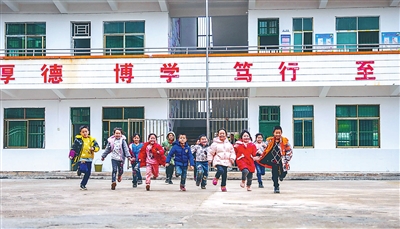 ③湖南省永州市新田縣駱銘孫小學學生放學沖出教室。