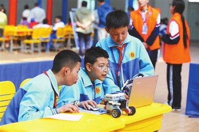 ③海北藏族自治州祁連縣小學生在參加機器人大賽。