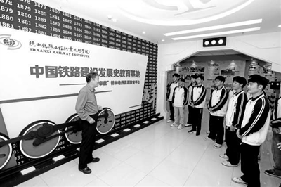 陜西鐵路工程職業(yè)技術(shù)學(xué)院黨委書記焦勝軍(左一)為學(xué)生講述中國(guó)鐵路建設(shè)發(fā)展歷程。資料圖片