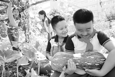 近日,在山東省高密市恒濤實驗小學,小學生在展示收獲的方瓜。近年來,該校因地制宜,以校園農場、校園果園的形式,讓學生們投入到勞動中,在豐富校園生活的同時,培養創新實踐能力,養成熱愛勞動的習慣。李海濤 攝