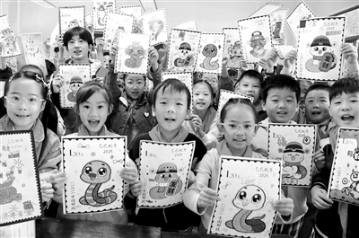 10月8日,在江蘇省鎮江市南徐小學,江蘇科技大學志愿者和小學生一起展示設計繪制的蛇年生肖郵票。當日,志愿者來到南徐小學,指導學生設計、繪制蛇年生肖郵票,迎接“世界郵政日”的到來。石玉成 攝