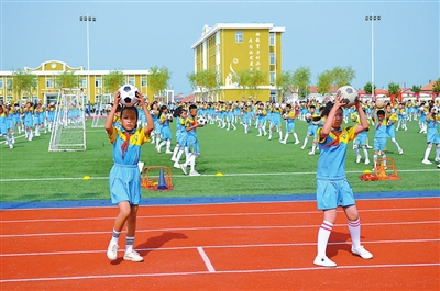 黑龍江省齊齊哈爾市泰來縣大興鎮中心學校的學生們在做大課間足球操,身后的樓外墻體上醒目地寫著“按教育方針辦學,走內涵發展道路”。該校的樓內樓外、主要會議室中都有與教育方針相關的學校文化標識。 資料圖片