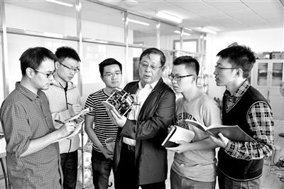 中國工程院院士、哈爾濱工程大學(xué)教授楊德森(右三)在指導(dǎo)學(xué)生做科研。 哈爾濱工程大學(xué)供圖