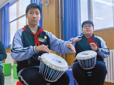 榮成第二十三中學(xué)的學(xué)生在漁家號(hào)子非遺傳承人的指導(dǎo)下,用非洲鼓傳唱漁家號(hào)子。 林艷春 攝