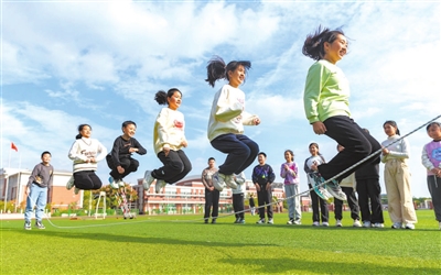 10月28日,江蘇省海安市城南實(shí)驗(yàn)小學(xué)的學(xué)生在課間跳長(zhǎng)繩。該校積極開(kāi)展“陽(yáng)光體育一小時(shí)”活動(dòng),通過(guò)多樣化的體育項(xiàng)目,增強(qiáng)學(xué)生體質(zhì),提高學(xué)生身體素質(zhì),讓學(xué)生們享受運(yùn)動(dòng)的快樂(lè),鍛煉出健康的體魄。