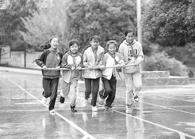 貴州省黔西市觀音洞鎮(zhèn)沙井小學的學生課間練習五人持桿跑。通訊員 周訓超 攝