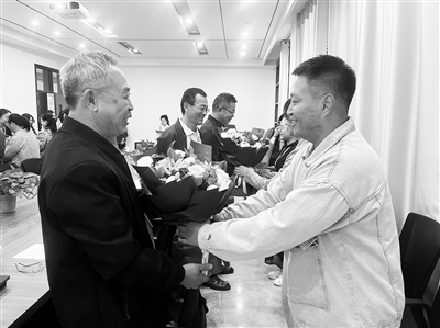 在山東省淄博市高青縣魯才高級中學“青藍工程”結對培養儀式上,青年教師為師父獻花。 學校供圖
