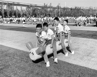 ②北京師范大學(xué)天津靜海實(shí)驗(yàn)學(xué)校學(xué)生們?cè)诖笳n間做體育游戲。本報(bào)記者陳欣然攝