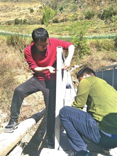 ③河海大學公益橋團隊學生常天亮用經緯儀現場測量橋位坐標。 學校供圖