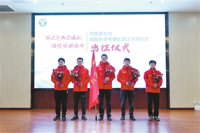 “出征!”“保證完成任務!”近日,由5名武漢大學師生組成的科考隊接過隊旗,正式出征中國第41次南極科學考察。本次出征既是武漢大學參與南極科考覆蓋面最廣的一次,也是武漢大學師生對習近平總書記一年前重要回信的響亮回答。