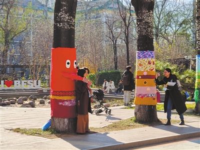 11月30日,人們在北京外國語大學和穿“毛衣”的樹木合影。近日,北京外國語大學校園內部分樹木穿上了“毛衣”,吸引路過的師生紛紛拍照留念。