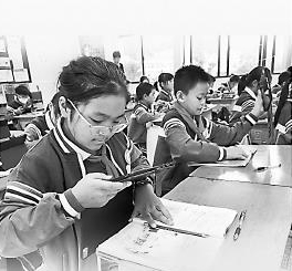 ①安徽省六安市金寨縣天堂寨同心小學(xué)學(xué)生使用平板電腦拍照上傳隨堂練習(xí)。