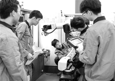 宜賓職業(yè)技術(shù)學(xué)院數(shù)控專業(yè)學(xué)生在調(diào)試工業(yè)機(jī)器人協(xié)助數(shù)控機(jī)床自動(dòng)上下料。