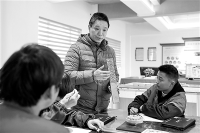 日前,安徽省行知學校教師方萌樂(中)在磚雕實訓課上向學生教授磚雕技巧。