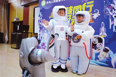 山東省青島人民路第二小學兩名身穿“宇航服”的學生與仿生機器狗互動。王海濱 攝