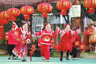 12月26日,在浙江省湖州市德清縣中心幼兒園,孩子們參加傳統民俗活動。元旦將至,各地中小學校和幼兒園組織多彩活動,歡樂喜慶迎接新年。