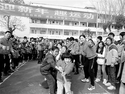 12月27日,在四川省達(dá)州市渠縣文崇鎮(zhèn)第一學(xué)校舉行的迎新年活動(dòng)中,黨員志愿者和學(xué)生進(jìn)行拔河比賽。