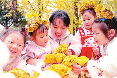 日前,浙江省湖州市長興縣水木花都幼兒園的教師和孩子們一起在銀杏大道上撿拾銀杏葉,設計制作出了一朵朵個性十足的銀杏葉簪花。活動中,孩子們親近大自然,鍛煉動手能力,發揮想象力和創造力。圖為教師和孩子們共同欣賞簪花作品。 通訊員 譚云俸 尹鍶 攝