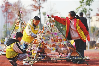 近日,湖南省永州市道縣紹基公園內(nèi)水杉、梧桐樹葉變黃,層林盡染,色彩斑斕。小朋友們前來收集斑斕落葉,制作成“樹葉帳篷”。 何紅福 攝