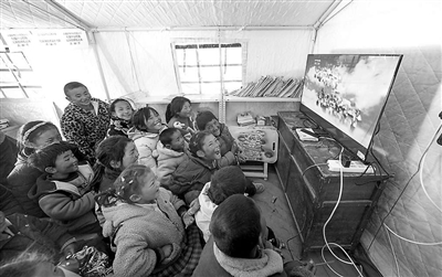 在定日縣長(zhǎng)所鄉(xiāng)嘎布村,孩子們?cè)诳础段饔斡洝罚?月14日攝)。