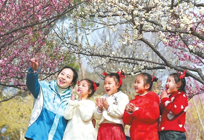 ①近日,浙江省湖州市長興縣龍山街道中心幼兒園師生在梅花園寫生。陳海偉 攝