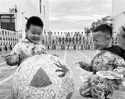 陜西省榆林市定邊縣第四幼兒園的孩子們在石礅上創(chuàng)作。路燕 攝