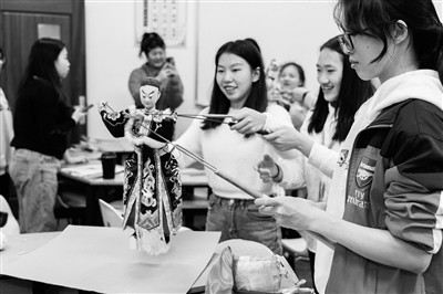 汕頭大學理學院、至誠書院通過深度融合社會大課堂與社區(qū)小課堂,打造“一站式”學生社區(qū)思政育人品牌——“鐵枝連‘理’戲潮音”,將非遺文化引入學生社區(qū)。圖為汕頭大學理學院與至誠書院學生在“一站式”學生社區(qū)中,學習操作鐵枝木偶。 曹瑋/攝 王風奇/文