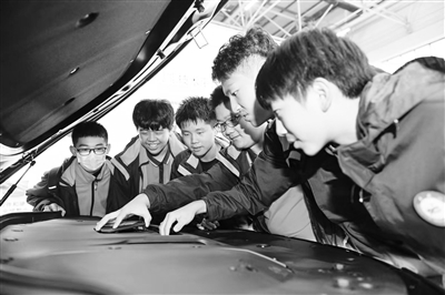 重慶一中的學生在工廠參觀智能汽車生產線。學校供圖
