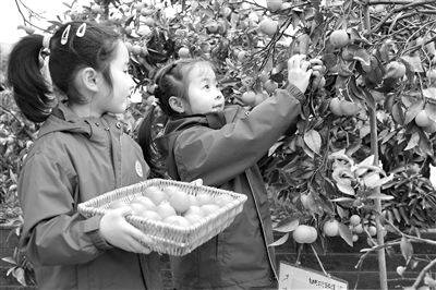 ③近日,在重慶市北碚區縉云幼兒園屋頂果園,孩子們在采摘成熟的柑橘。 秦廷富 攝