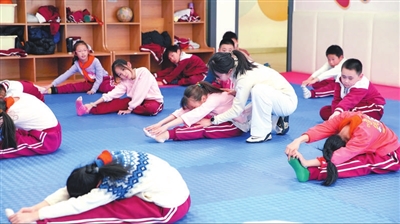 ②李照藝在北大附中西三旗學校小學跆拳道專項課上進行柔韌練習指導。