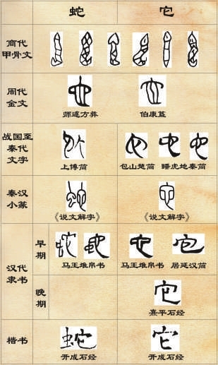 東漢許慎在《說文解字》中將“它”字的篆形解釋為:“它,蟲也。從蟲而長,象冤曲垂尾形。上古草居患它,故相問無它乎。凡它之屬皆從它。蛇,它或從蟲。”上古時代,草莽叢生,蟲蛇出沒,先民草居野處,經常受到蛇的侵擾,因此見面時便關切地問:“沒有遇到它(蛇)吧?”章太炎在《〈說文解字〉授課筆記》中就說:“一切動物皆著蟲旁者,以古無房室,草居野處,所患者蟲,故無它即無蛇也,于是以蛇表一切動物。”許慎說的“它或從蟲”這個“蟲”字,讀huǐ,后來寫作“虺”,《說文解字》中說:“蟲,一名蝮,博三寸,首大如擘指。象其臥形。”根據解釋我們可以知道“蟲”為蛇之一種,體寬三寸,頭較大,并非今天的簡體字“蟲”(繁體為“蟲”),在《說文解字》中是獨立的一個字。《說文解字》中“它”和“蟲”的篆形是在戰國文字基礎上的進一步規整,但表示蛇頭與蛇軀體的線條依然是相接的。從許慎的解釋看,二者所指本為同一種動物,所謂“象冤曲垂尾形”“象其臥形”的不同,應是其篆形之別,而非指不同的動物。