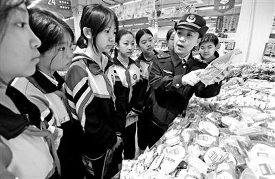 3月14日,河北省邯鄲市邯山區市場監督管理局的工作人員為邯山區開元小學的學生講解辨識安全食品的方法。該校開展“消費權益我守護”主題教育活動,學生們在工作人員的帶領下來到超市學習日常消費維權知識,遠離“三無”產品,爭當維權小衛士,迎接“3·15”國際消費者權益日的到來。