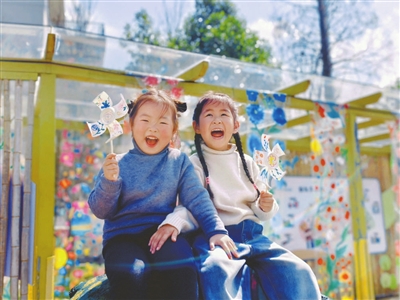 在溫暖的春日里,浙江省麗水市龍泉市八都鎮中心幼兒園的孩子們手持五彩斑斕的自制風車,在操場上歡笑著。他們的笑聲與春風交織,風車在陽光下旋轉,定格了春天最美好的瞬間。李春萌 攝