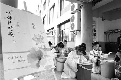 浙江省衢州市實驗學校教育集團靈溪校區的學生在“童年詩光機”活動中興致盎然地吟詩作對。黃紫依 攝