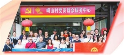 參加珞珈國際夏令營的外國高校師生與武大馬院志愿者參訪湖北鄂州峒山村黨員群眾服務中心。學校供圖
