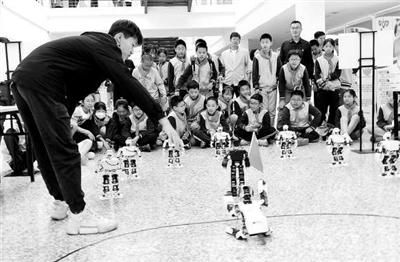 ①在江蘇大學第四屆計算機文化節上,大學生帶著該校附屬學校的小學生觀賞智能機器人表演。