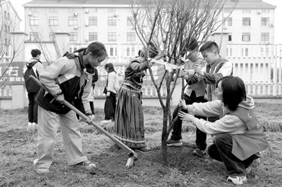 ②浙江省東陽市巍山鎮第二小學校內,大學生和小學生一起種樹。