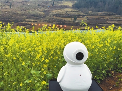 驅鳥機器人守護油菜田。 資料圖片