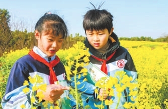 安徽師范大學附屬含山實驗學校的學生在觀察油菜花。 歐宗濤 許麗 攝