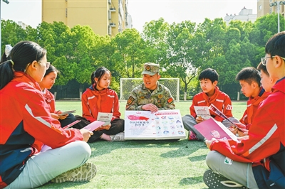 4月8日,在安徽省合肥市廬陽(yáng)區(qū)林店街道六安路小學(xué)榮城花園分校,學(xué)生正在聽(tīng)該街道武裝部工作人員講解國(guó)家安全知識(shí)。 趙明 攝