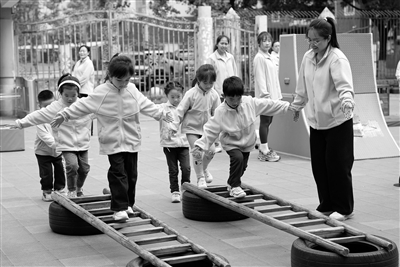 近日,在江西省吉安市吉州區保育院操場,孩子們在進行體適能訓練。該保育院因地制宜規劃校園室外空間,滿足幼兒大動作發展需求。李軍 攝